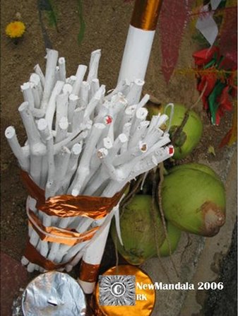 Those who seek to explain (or justify) the overthrow of Thaksin in terms of Thai style democracy may argue that legitimate power in Thailand is based on narrowly defined Buddhist virtue. But it seems that even the Generals recognise the sacred power of peripheral practice. This ritual incursion into Thaksin’s northern heartland is an attempt by the junta to align itself with forms of belief that are often disparaged by Thaksin’s critics as superstition, ignorance and voodoo. General Sonthi clearly knows better.