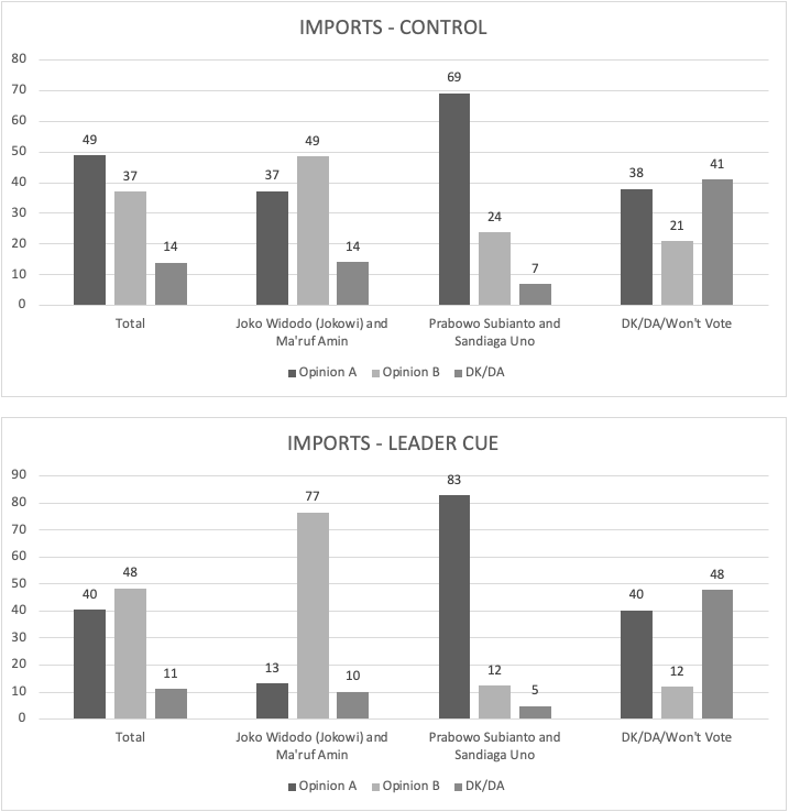 The data indicate that public opinion on this issue is already polarised even without being exposed to leader cues. A strong majority of Prabowo supporters are opposed to foreign imports. These results are not surprising, because Prabowo has long cast himself as a champion of Indonesian farmers, local business, and as stridently nationalist in his economic outlook. Jokowi voters in the control group, on the other hand, are more divided on this question of imports.