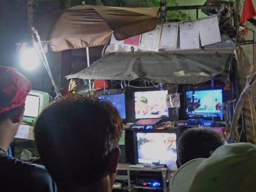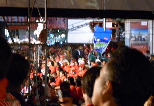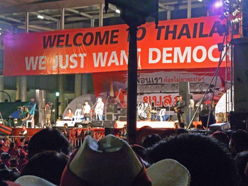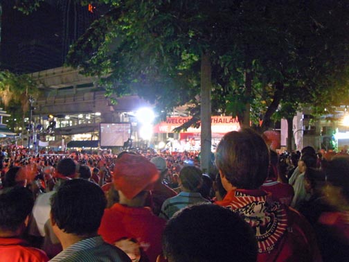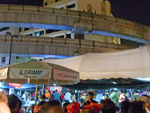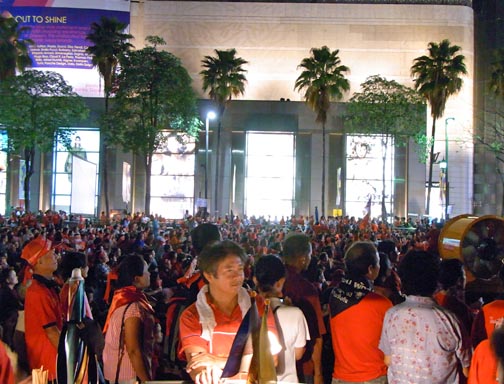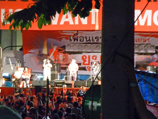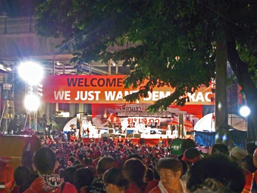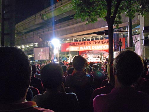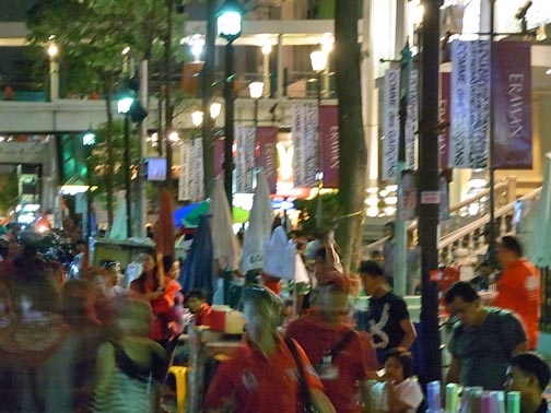 The attached series of photographs was taken on Saturday evening April 17th around 10PM in and around the Central Bangkok/Rajprasong main demonstration site for the Red Shirt protests. There is nothing “spectacular” or particularly newsworthy in the photos. In fact, they are rather ordinary and hopefully will communicate how surprisingly “everyday” and more or less peaceful the red shirt gathering and red shirt demonstrators are. Not at all the image of out-of-control and dangerous barbarian hordes the present Thailand government is promoting so relentlessly. Thailand citizens of all ages, gathered in a public space listening to their various leaders deliver speeches in a peaceful way. Food stalls, souvenir stands, handclappers, banners, flags, lines of porta-potties, families, groups of people from the same neighborhoods, towns and villages.