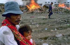 Mr. Bedu (45 years) population of the East with his son witnessed the Ancol building tent while hers was demolished and burned by the Trantib North Jakarta during the eviction of poor citizens, October 24, 2001, 2002, Photo: Arie Basuki