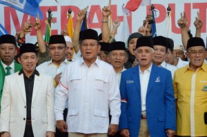 Indonesian presidential candidate Prabowo Subianto (C-in white) with his running mate Hatta Rajasa (2nd R), Aburizal Bakrie (1st R) head of Golkar Party, Anis Matta (1st L) president of Justice and Welfare Party, sing along after the declaration of permanent coalition in Jakarta on July 14, 2014. Indonesia’s president on July 11 urged the election chief to ensure a transparent vote count following this week’s disputed presidential poll, after both sides raised fears the other may tamper with the ballots. AFP PHOTO / ADEK BERRY (Photo credit should read ADEK BERRY/AFP/Getty Images)