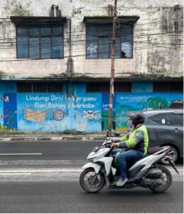 Caption- A delivery driver rides past a mural that reads “Protect yourself:your family from the danger of drugs” (author photo)