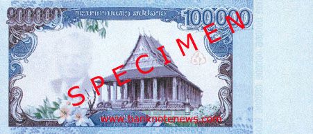 On the occasion of the 450th anniversary of Vientiane becoming the “capital of Laos” – to be marked with a state spectacular at the National Stadium tonight – the central bank has issued a commemorative banknote with the denomination of 100,000 Kip (images here, other Lao banknotes here).