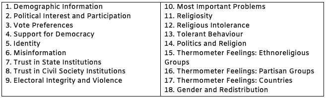 We developed a set of core modules that are asked across all 58 surveys. That the surveys have overlapping core questions, and are fielded weekly means that SIKAP offers insights on how voters’ attitudes on an issue may change as a response to a political event.