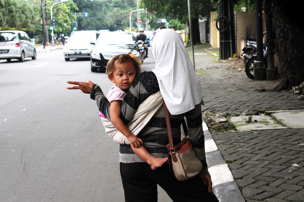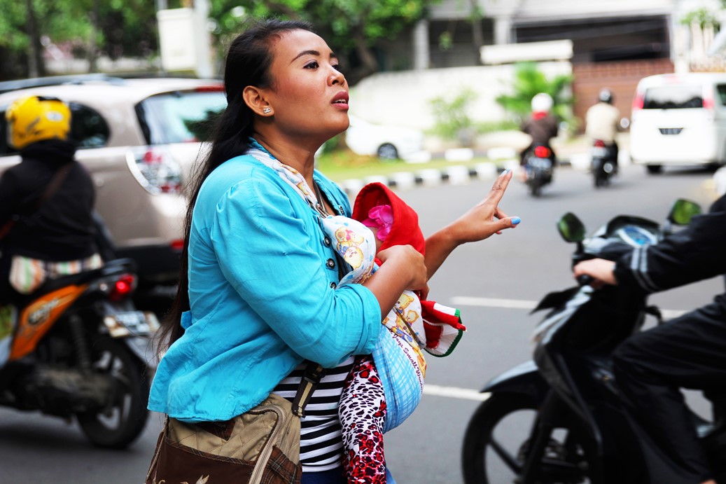 “I travel from Kemayoran and I get here every morning by 7 am. I get paid around 25,000 rupiah a trip but it’s usually whatever the driver picks. I bring my granddaughter along to make more money but sometimes it’s difficult bringing a young child with me, she gets bored and restless. I don’t think about getting caught because I have to make money to the pay rent and feed my family back home. My children and my grandchildren depend on me.”