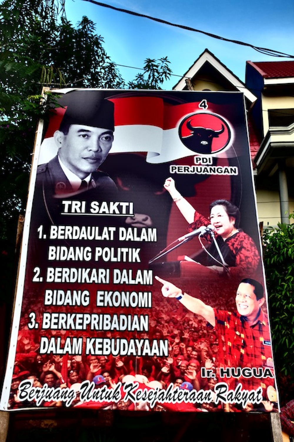 Poster featuring Soekarno, Indonesia’s first President, his daughter and head of PDIP Megawati Soekarnoputri, and Hugua. Author photo.