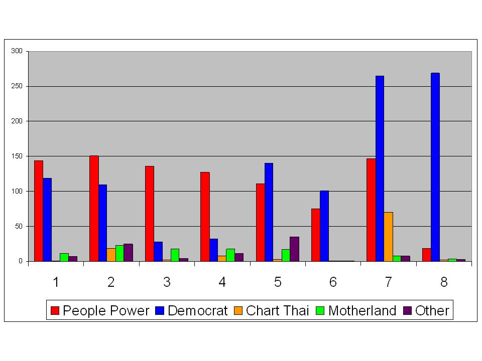 Here is a graph (click for larger version) with some relatively early party list counts by region (a total of about 2 million votes). The graph highlights some of the regional difference. In Zone 1 (northern Thailand) and Zone 2 (lower north and some of the northeast) PPP is ahead but the Democrat Party has attracted a solid vote. In Zones 3 and 4 (northeast Thailand) PPP dominates, as expected. In Zone 5 (eastern Thailand) and Zone 6 (Bangkok) the Democrat Party is ahead but the PPP vote is respectable. In Zone 7 (central and west Thailand) and Zone 8 (southern Thailand) the Democrat Party is well ahead. Overall these results are suggesting that PPP will win 36 party list seats and the Democrat Party 34.