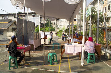 Voters waiting in line in Tamantiro, Yogyakarta.