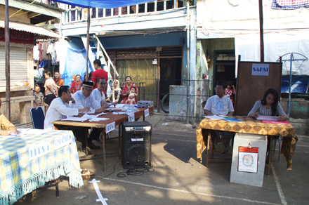 Vera Altmeyer from Roskilde University and New Mandala’s Tom Power spent this morning visiting polling stations in Kebon Kacang and Kebon Melati, Tanah Abang, Central Jakarta. Central Jakarta proved difficult turf for Jokowi during the 2012 Jakarta Gubernatorial Elections: it was the only of Jakarta’s administrative municipalities in which he was outperformed by Fauzi Bowo. These polling stations are in the immediate vicinity of Pasar Tanah Abang, Southeast Asia’s largest textile market and a centre for small traders and street stalls, as well as Jakarta’s grey economy and the extortion rackets associated with it.