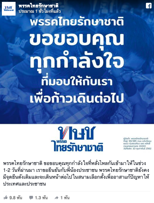 In the party’s first public statement after “accepting the royal command with loyalty toward His Majesty”, Thai Raksa Chart has released the following Facebook statement: “The Thai Raksa Chart Party would like to say thank you for the outpour of encouragement that has come in over the past 1–2 days. We stand with the people. We stand by our original principles and will continue to walk forward in the electoral arena in order to solve problems for the country and the people”.