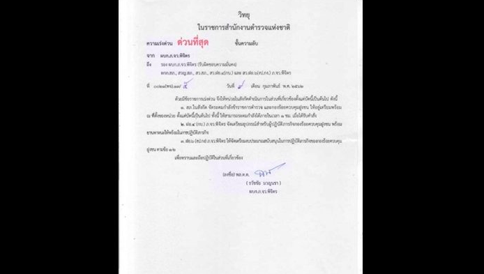 Yesterday on 10 February 2019, reports emerged of a written order issued via the Royal Thai Police’s radio network. The document, classified as “of upmost importance” and at the level of “secret”, was sent from the Phichit Provincial Police Commander to the Deputy Phichit Provincial Police Commander (who is in charge of security). It was then sent all the way down to district superintendents, district chief inspectors down to the inspector of general staff division 4 and the inspector of general staff division 6. The order was issued on 9 February 2019 and read: