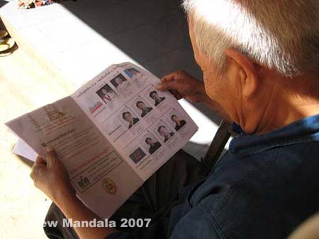 From AW in Canberra, 10.00 PM: Earlier today (see below) I provided some images from voting in Baan Tiam, the village in northern Thailand where I have been undertaken research for the past few years. The votes have now been counted and PPP has won. There was a high voter turnout with over 90 percent of registered voters turning out. There was less than 10 percent spoilt vote or no-vote. In the party list voting 52 percent voted for People Power, 28 percent for Democrat and 4 percent for Motherland. In the constituency vote, People Power candidates were the three highest ranked candidates.
