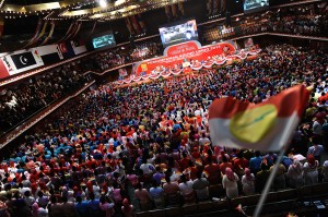 KUALA LUMPUR, 5/12/2013.Members of the ruling party United Malays National Organisation (UMNO) sing during the opening ceremony of the annual general assembly at the Putra World Trade Center (PWTC) in Kuala Lumpur.The ruling party UMNO’s six day general assembly 2013 began with the official opening by the party President Najib Razak. THE MALAY MAIL / SHAHIR OMAR