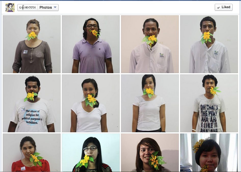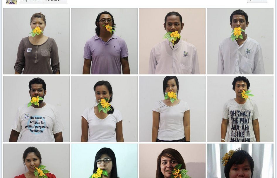 Over the next few days my newsfeed began to be taken over by similar photographs, of friends with flowers in their mouths, out on Yangon’s hot streets distributing stickers, posters, t-shirts, wristbands; singing songs, speaking out against speech that causes hate, calling for a pan zagar movement. A Pan Zagar Facebook page gained followers by the thousand, daily. When the Thingyan holiday arrived I escaped for a quiet paper-writing refuge with family, but each day, each time a group in a new city joined the movement, their photos appeared as a reminder in my newsfeed: “Speak pan zagar.” A reminder: you are not alone in your opposition to sparking hatred.