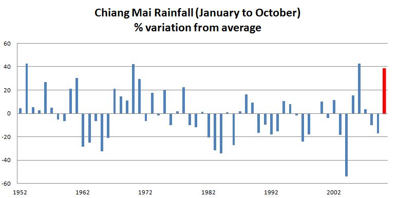 Here are some more graphs showing the percentage variation from the average for rainfall in Chiang Mai, Lamphun, Uttaradit and Phitsanulok. The red bar is the 2011 figure. The Chiang Mai graph is based on a different (more recent) data series to the graph I provided last Friday, and the 2011 is a little less exceptional given the very high falls in 2006 (in addition to 1953 and 1970). However the graphs for Lamphun, Uttaradit and Phitsanulok underline just how wet 2011 has been.