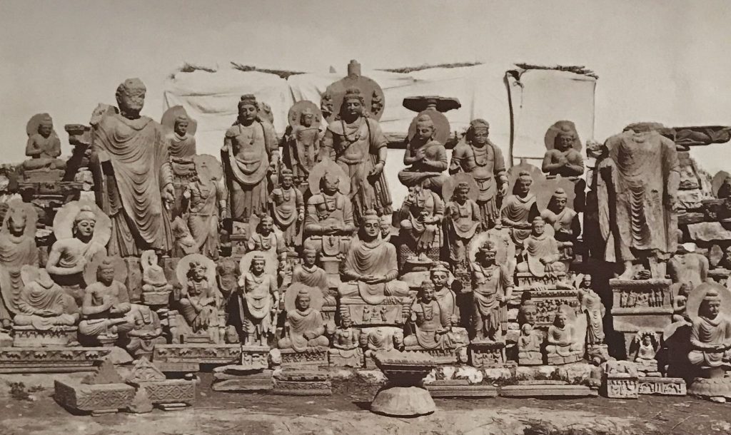 Rather than presenting a wall of educative text, these two panels offer both a photo and a list of questions. The photo is from the 19th century, and shows ancient Buddhist sculptures from Gandhara excavated by the British during their rule in India. The sculptures are assembled as if for sale, ready to be plucked out by the discerning buyer. Many sculptures or sculptural fragments like those shown in the photo are now on display in museums throughout the world – including as part of the Asia Society Museum Collection.