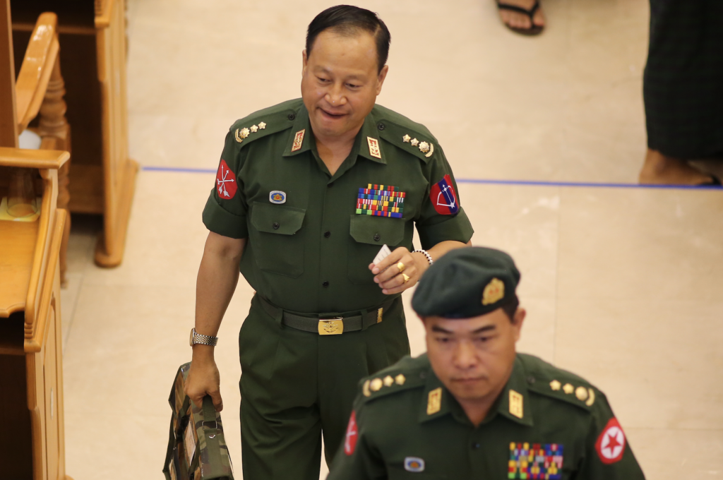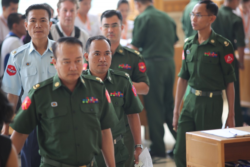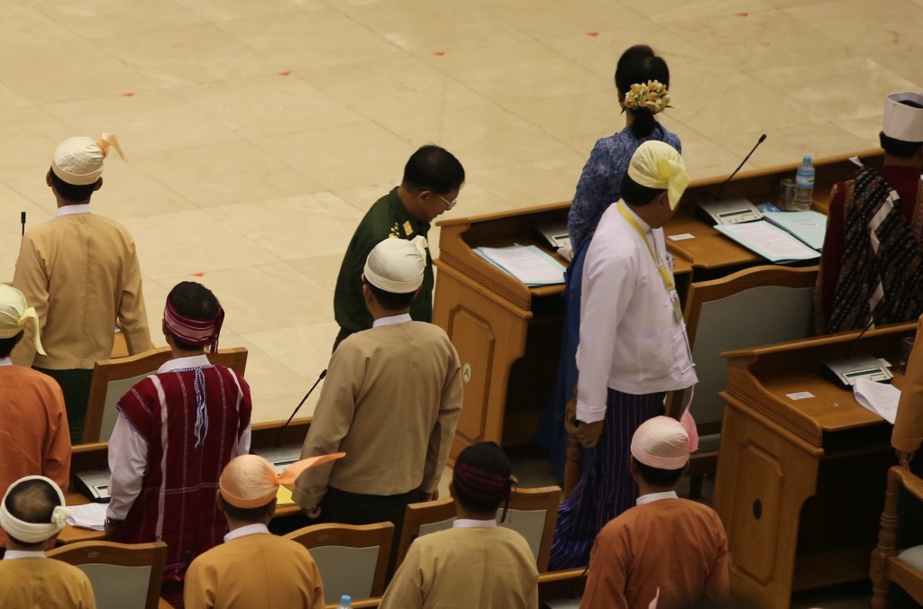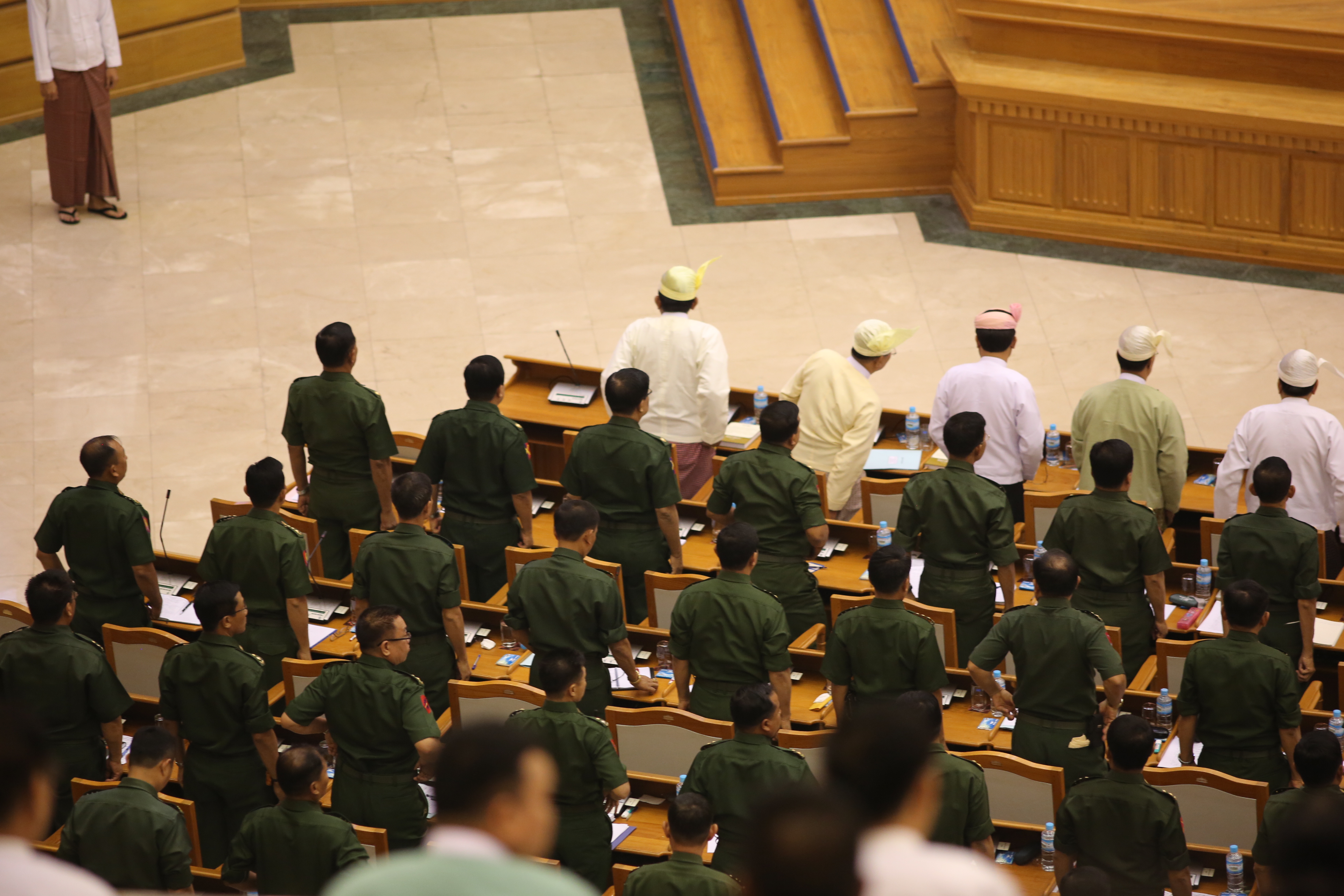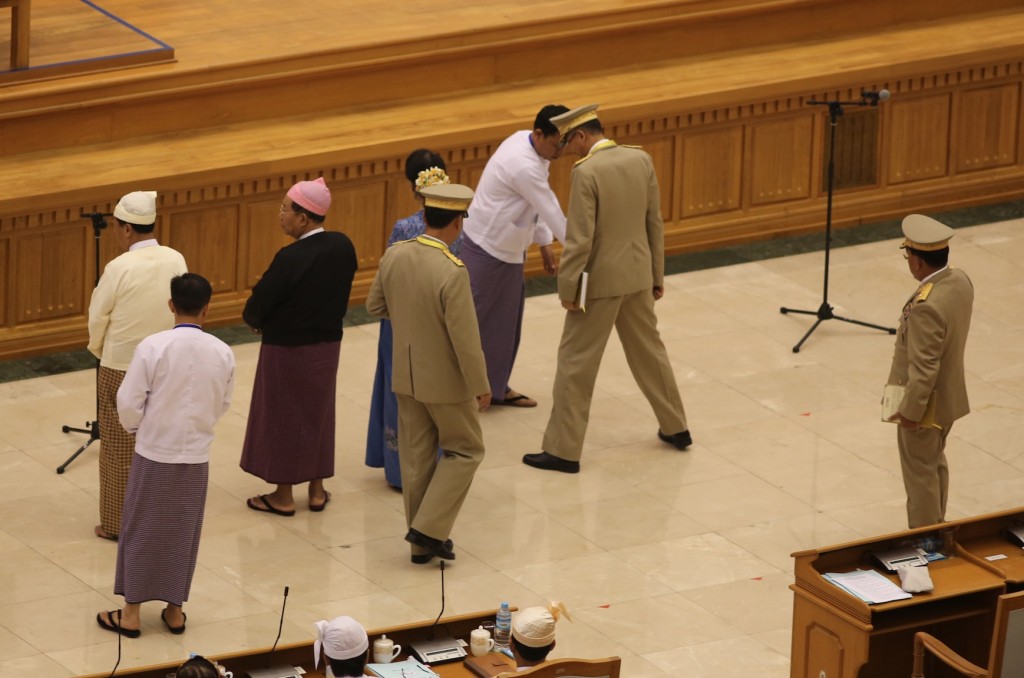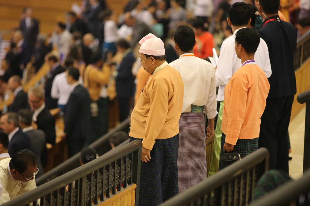 While the audience stood up as Daw Aung San Suu Kyi walked in, unsurprisingly, the Commander-in-Chief of Defence Services Senior General Min Aung Hlaing remained seated.