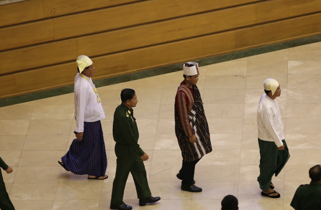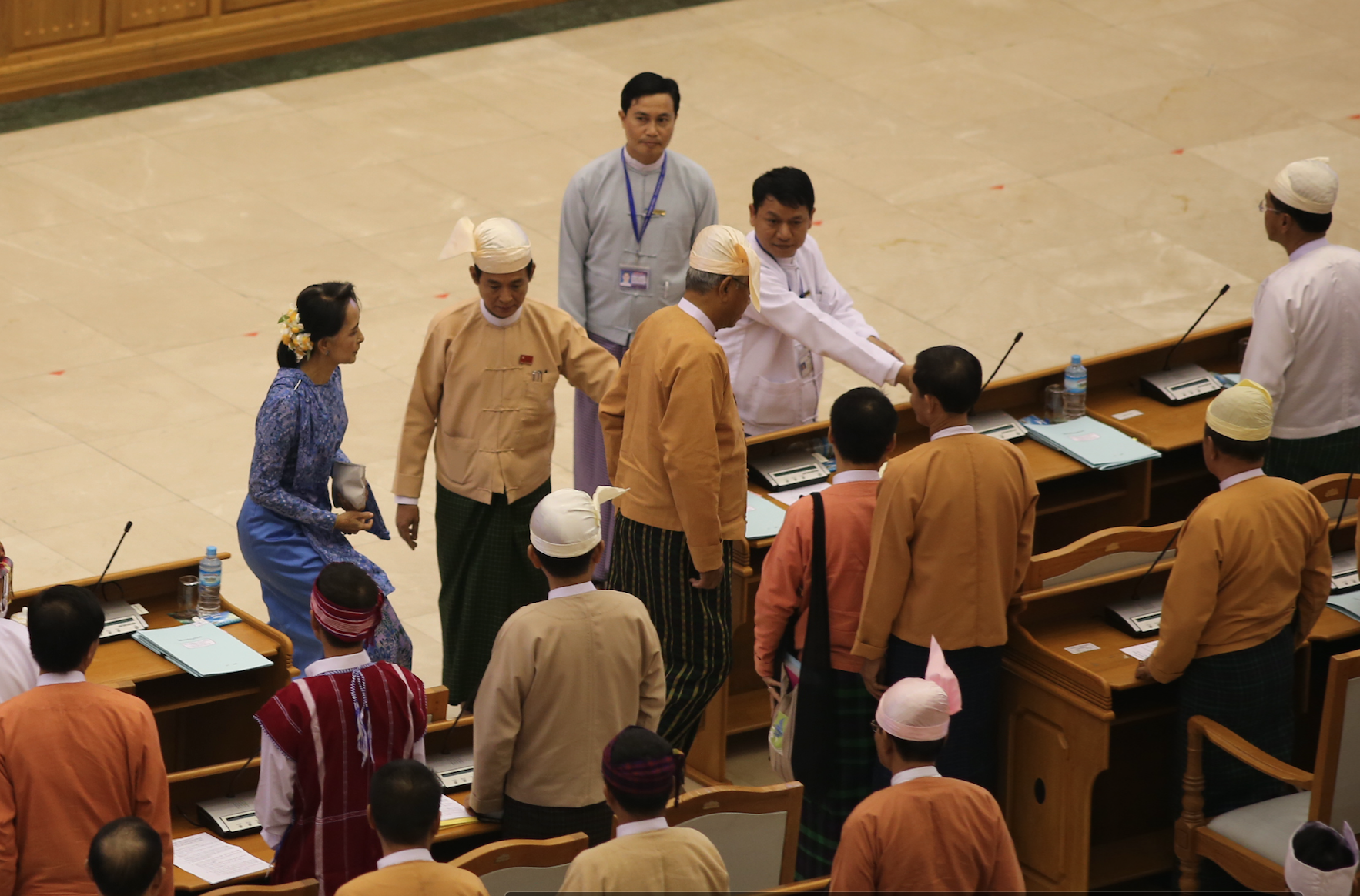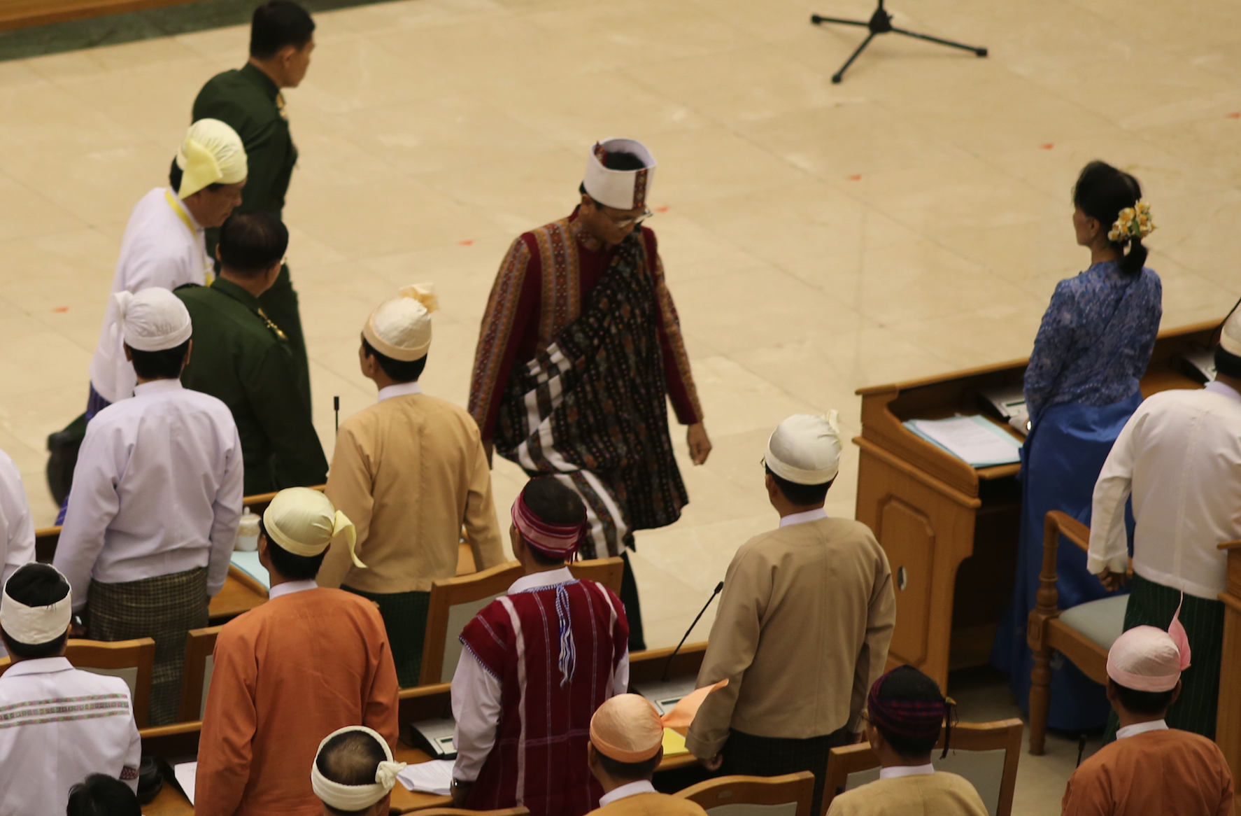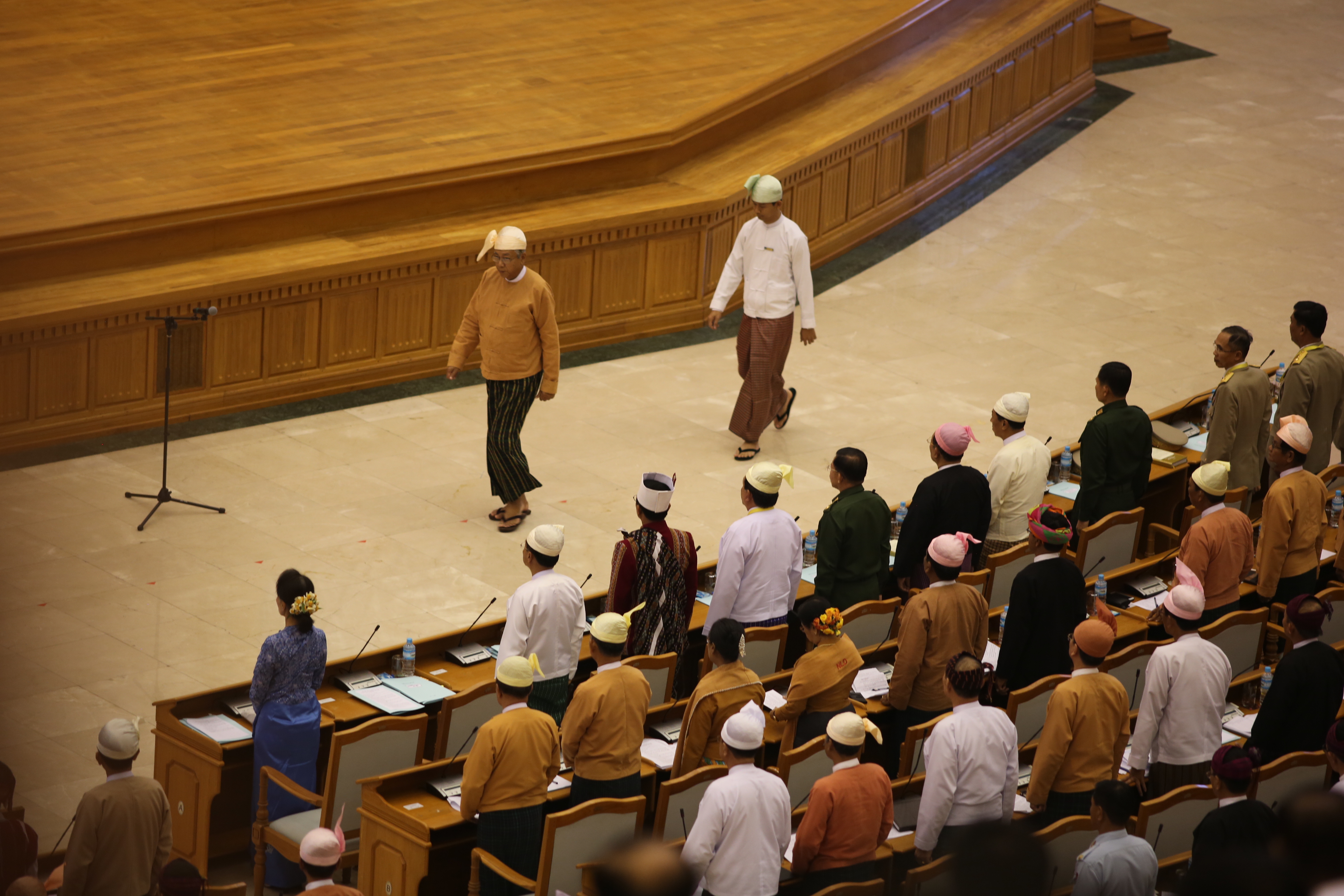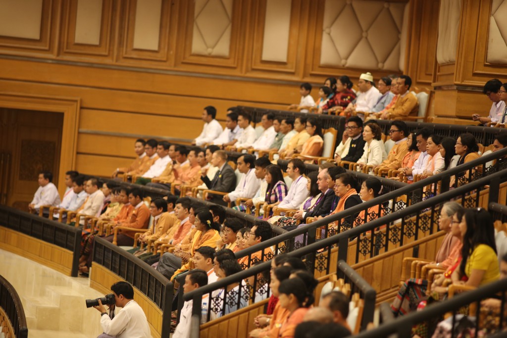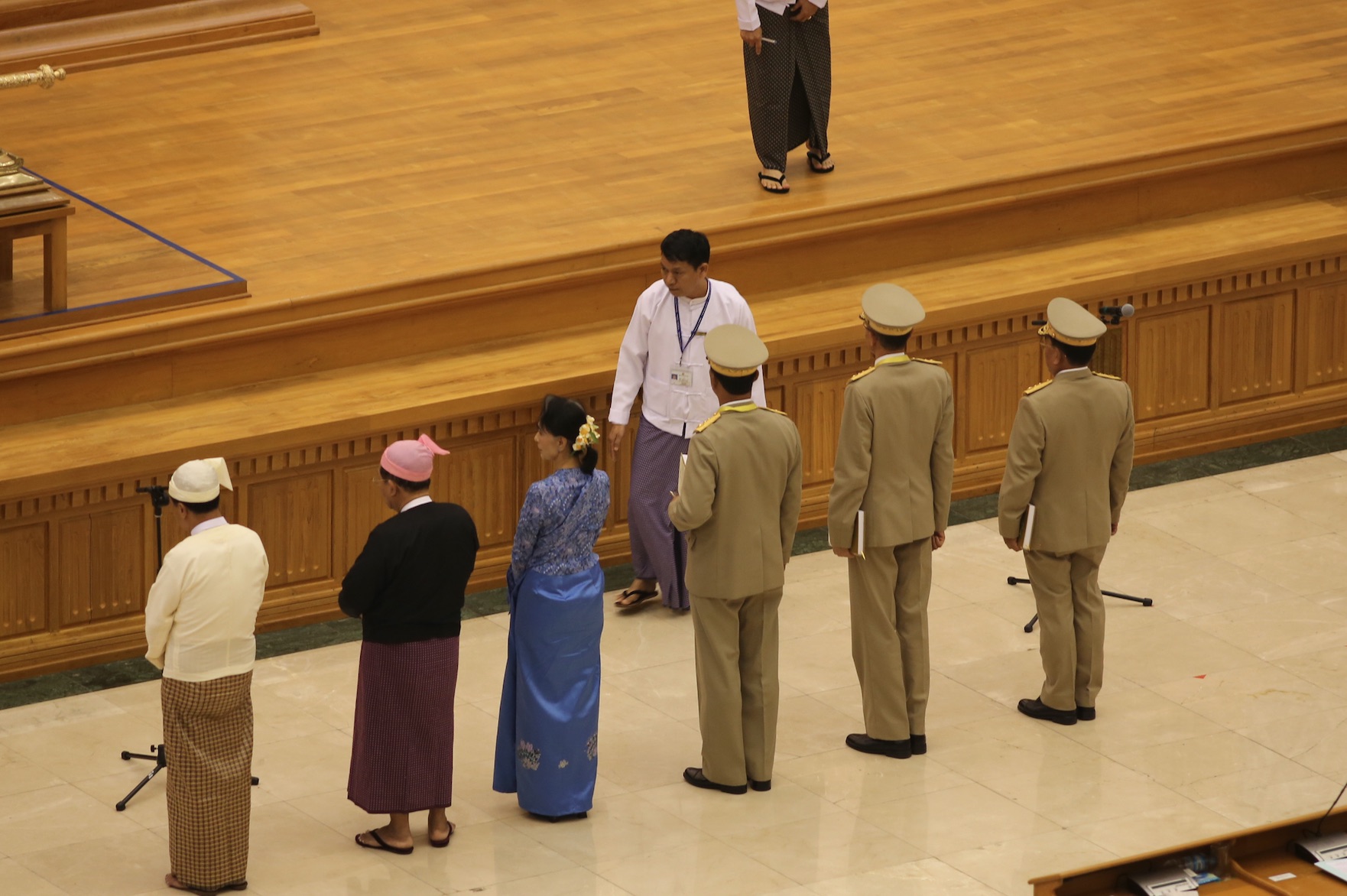 The Hluttaw was packed to the brim as a new president, two vice-presidents and 18 minsters gave their oath. Watching on were members of parliament–both civilian and military–the diplomatic community, close allies of the National League for Democracy, and domestic and foreign media.