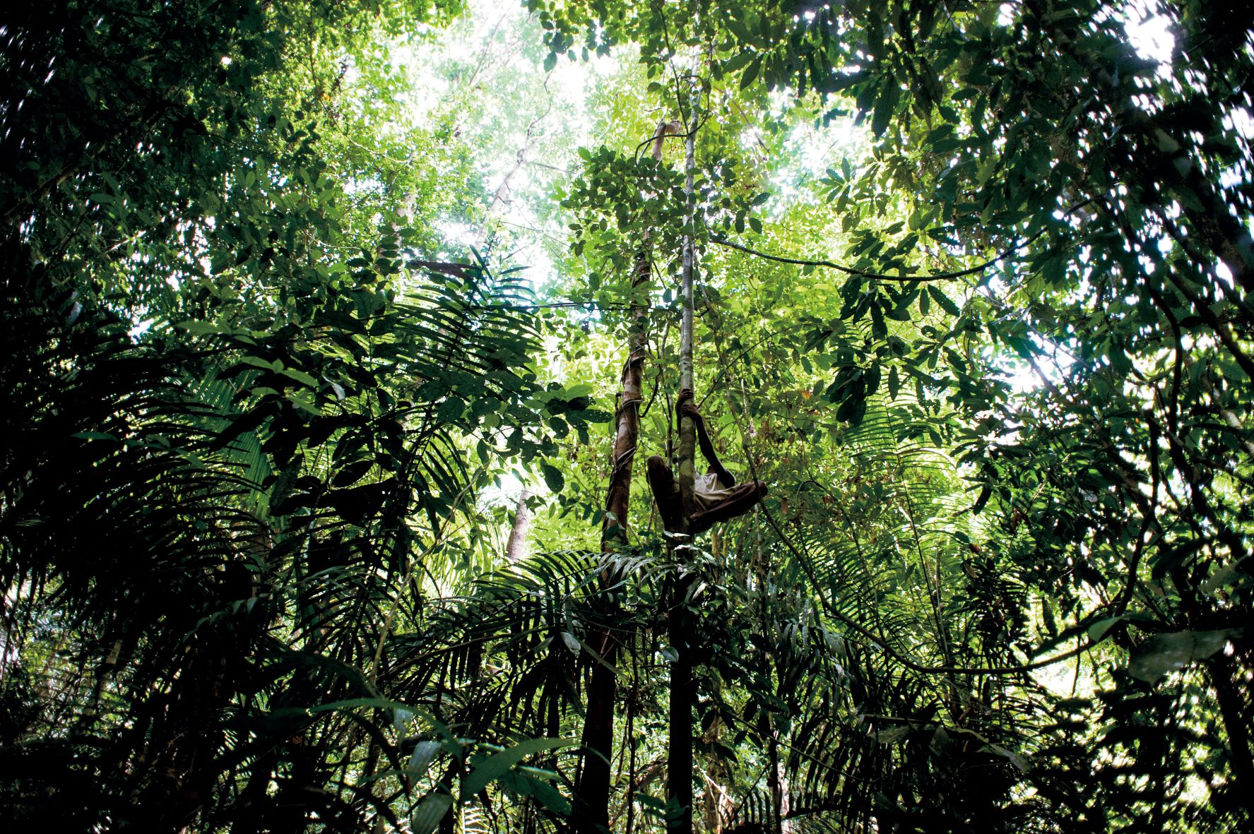 Fig 2. Landscape is made through practice. A Batek youth scales a fruit tree, 2014. [Photo by Lye Tuck-Po]