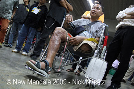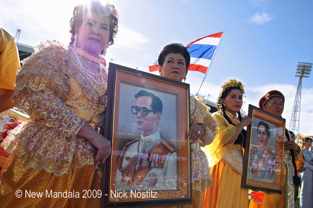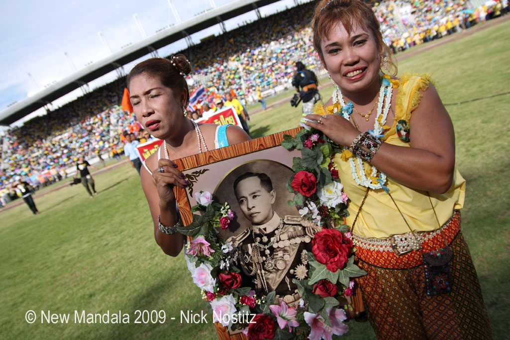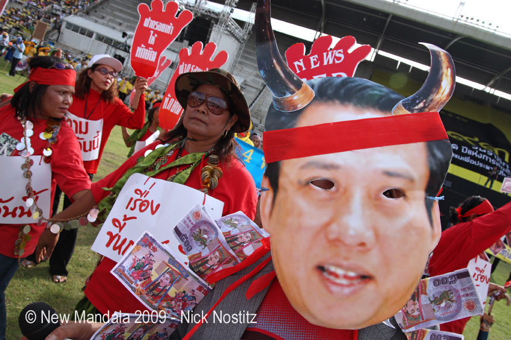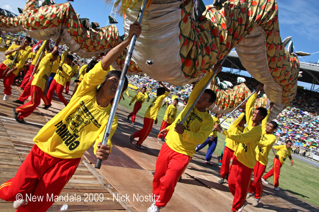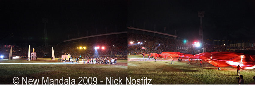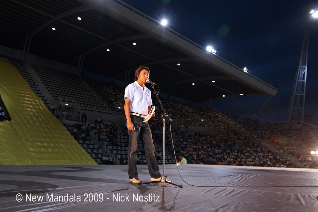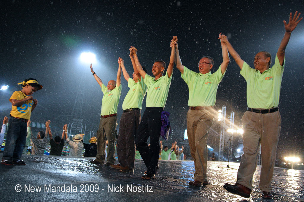 On 25 May 2009 the People’s Alliance for Democracy (PAD) lavishly celebrated the decision to found their political party in the sports stadium in Thammasat’s Rangsit campus. There were marches by the various PAD chapters of the different provinces in folkish costumes, and a large show re-enacting the sanitised history of their protests of last year, which went on despite the heavy downpour. About 30,000 PAD members attended the event. The theme was overwhelmingly dominated by strongly royalist and nationalist symbolism. Of course their opponents, the Red Shirts and the Thai Rak Thai and People Power Party governments were also criticised, but with much less intensity than usual. All 5 core leaders attended, alongside many celebrities as well. Painter Vasan Sittikhet spoke on the stage, and also Sondhi’s son Jittanart Limthongkul. The 7 October 2008 teargas victims were present as well. The atmosphere was celebratory similar to the pre-coup PAD, their guards were not visibly armed and threatening like during last year’s protests. It was also unusual how easy we journalists could mingle with the PAD VIPs, the standard phalanx of Naclop Srivichai blocking access was not present yesterday.