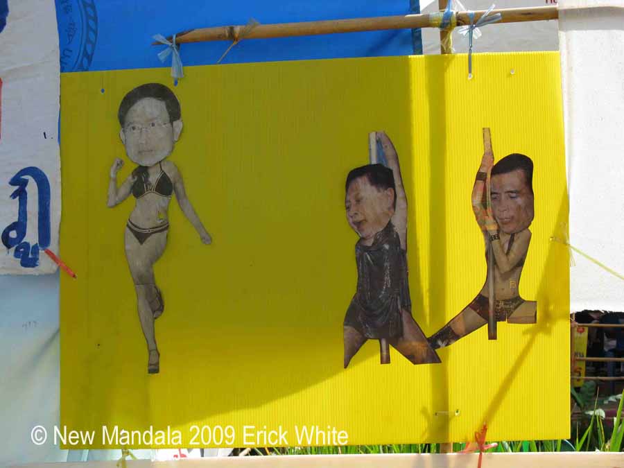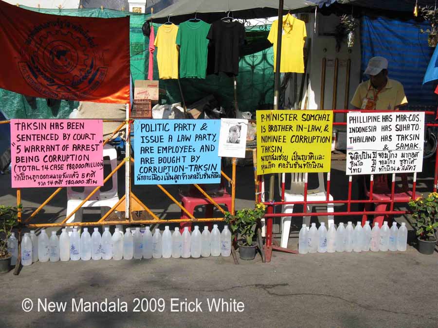 A significant amount of the political art at the site was mass-produced by the movement itself, and overall it presented a relatively coherent, structured and focused set of themes and images. But some of the most interesting and visually arresting art was handmade and represented the more idiosyncratic political views and visual imagination of a single individual. Some of it was quite large and didactic, as in the cloth banner of the first photo. Other imagery, as in the second photo, was much more simple and crude, but played on another pervasive theme in the site’s protest art – sexual degradation and perversion – in this case reinforcing the notion of a morally fallen government through the common idea of the go-go dancer. Fear of sexual inversion, instead of revelry in it, plays out in the poster of the third photo, with its warning about the dangers of Thaksin’s wife. And last, and one of my favorites, a very creative person turned these sorts of images into literal fun and pleasure by creating a politically-themed home-made pinball machine.