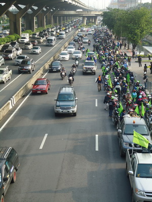The caravan passing through Nakorn Sawan on day 2 of the journey. The green flags contained the logo of P-move and slogans of the movement. The motorbikes formed three lines and took up two lanes from this point on.