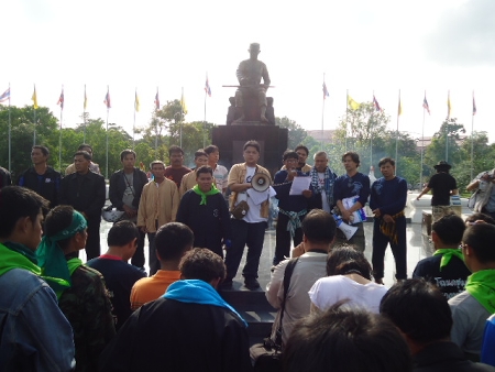 The next morning, the caravan travelled a short distance to Naresuan University in Phitsanulok where they made merit in front of the statue of King Naresuan and then read a press release for reporters from Thai media who were contacted beforehand to meet them there.