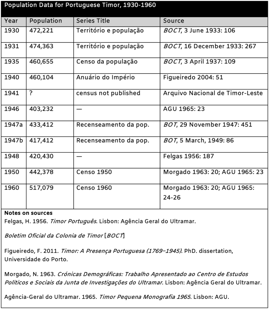 Taking a comparative perspective, we might also assess the possibility that Portuguese Timor experienced an entire decade of population stagnation by considering rates of population change elsewhere in Southeast Asia. The demographer Charles Hirschman has compiled figures for a number of territories in the region, which show the following for the 1930s: the population of Burma grew by 1.1%; that of Peninsular Malaya grew by 1.6%; and that in Thailand grew by 2.6% between 1929 and 1936.