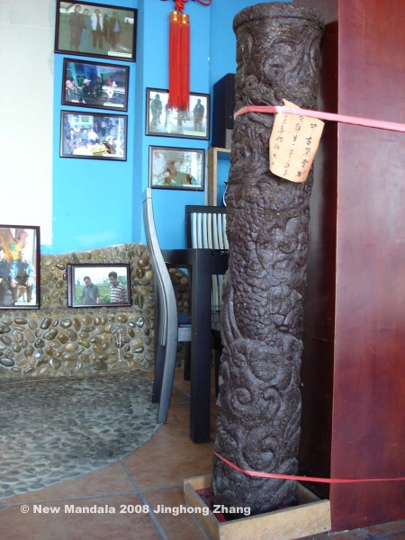 A big tea storehouse called tian xia cha cang (tea storehouse for the world), was established in Yuanjiang, Yunnan, in 2006. Yuanjiang is located in the moist and hot area of Honghe (Red River) valley, in southeast Yunnan. And it is said that one year’s storage here would be equal to three years of storage in Kunming. I visited it in June last year. All the teas were stored in the warehouse under controlled temperature and humidity (picture above). There I saw a compressed Puer tea in the shape of a pillar, whose color had turned dark red, really like shu cha, artificial fermented tea, although later I found it was actually sheng cha, naturally fermented tea (picture below). The label said it was produced in 2001 and been stored in Yuanjiang since 2003. I was shocked because I’d never seen such fast change on Puer sheng cha with the same age in Kunming.