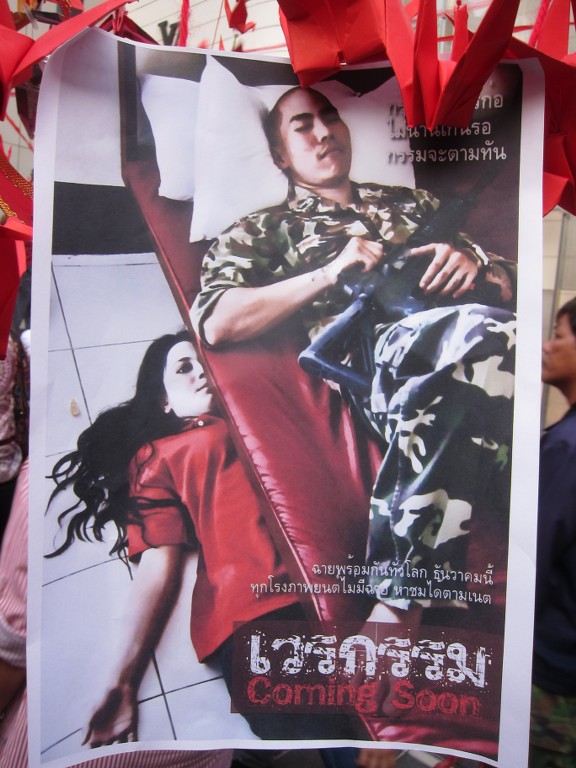 Here are some images of yesterday’s Red Shirt protest at Ratchaprasong taken by an anonymous New Mandala reader. Several paintings were exhibited there including a very large homage to Guernica, with some Thai symbolism. A large white piece of plastic was placed in front of the paintings, and protesters were encouraged to write down their thoughts. (Note: some readers may find some of the comments offensive. They are provided here because they illustrate an important trend in the sentiments of at least some of the protestors.)