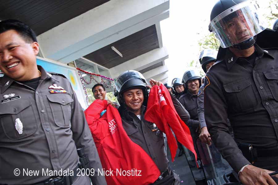 The police inside were relaxed and very positive about the behaviour of the protesters as compared to when they encountered the PAD. A hilarious de-escalation tactic happened when the Red Shirts gave some of their paraphernalia through the gate to police officers. One officer who received Jakrapop’s jacket was particularly happy. After this, the mood was completely relaxed, both inside Parliament and outside.