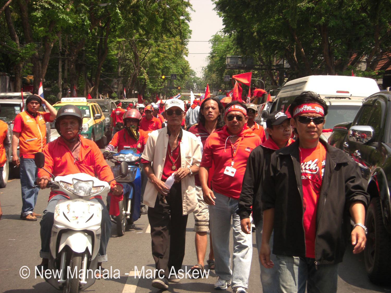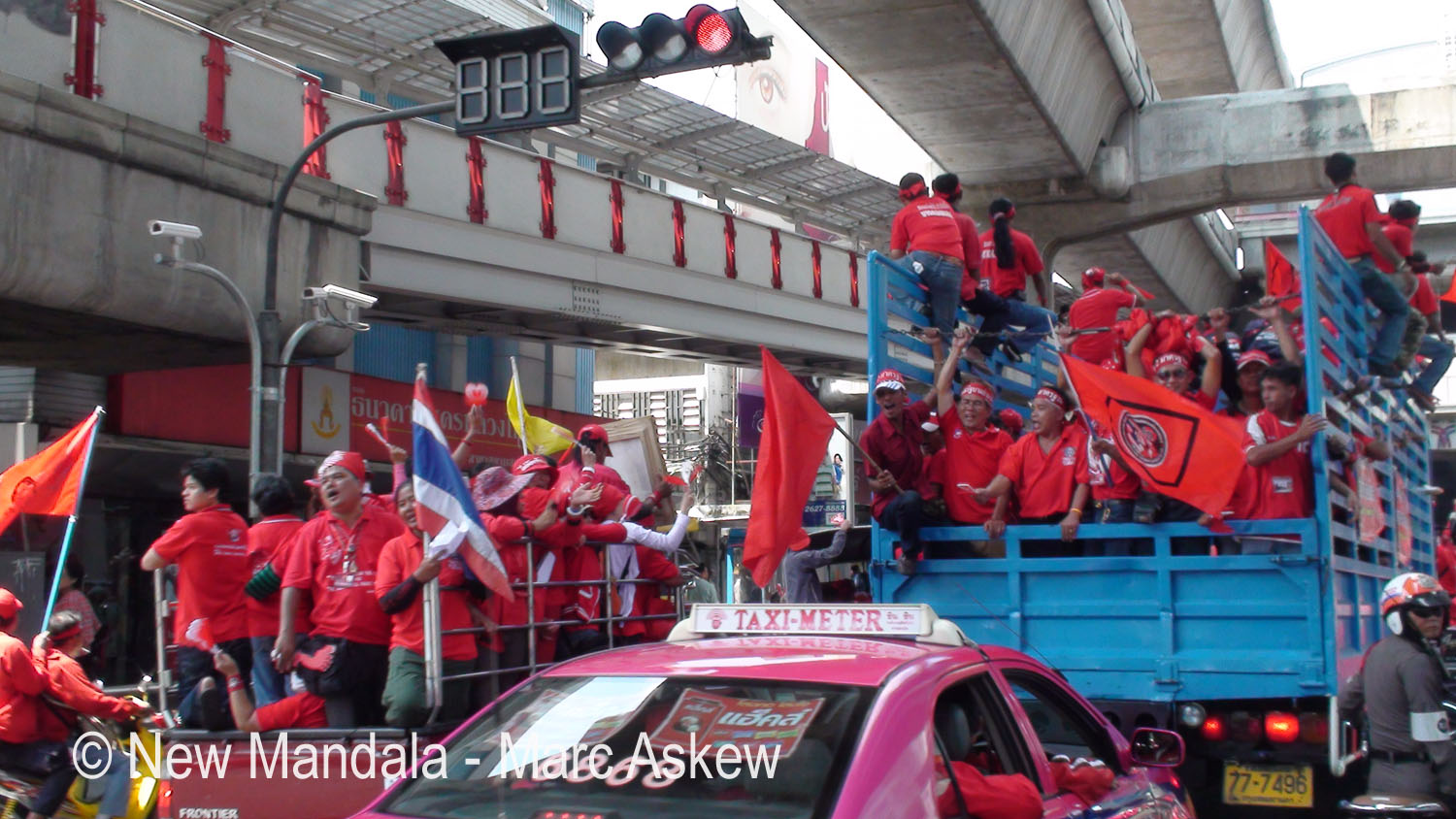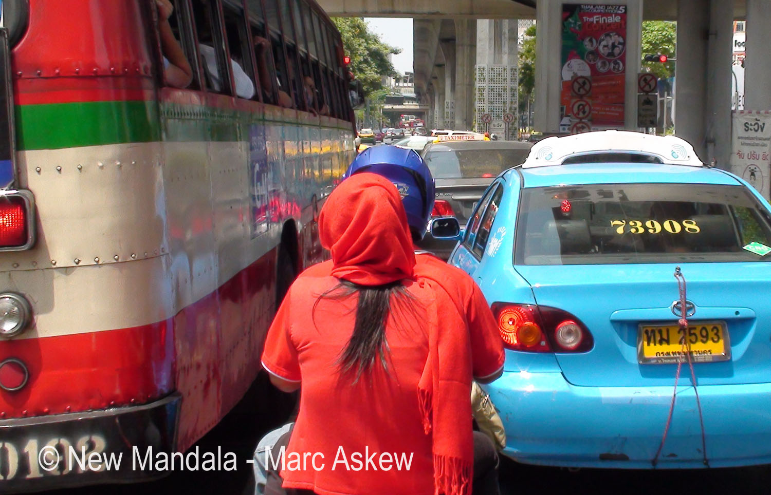 My perspective here is from the vantage point of the Bangkok street, where, by accident rather than design, I have turned up during key moments of confrontation – October 2008, March 2009, and again March 2010, from Thailand’s primary red zone, the southern border provinces, my main field of research. When in Bangkok, I usually stay at a small guest house in a soi in Bangkok that has been “red” since October 2008, when local people responded angrily to the yellow shirt confrontation with police in front of parliament house, a prelude to the destruction of the Somchai government two months later. From the restaurant waitresses, the families running the small restaurants, the hairdressers, the travel agents, the dry cleaners, the newsagents, the lottery ticket sellers, the taxi drivers to the ubiquitous motorcycle taxi riders — all oppose the current Democrat-led government as illegitimate. The owner of this guest house (let’s call her Daeng) is a native of Loei Province in the upper northeast. Daeng has attended every major red shirt gathering since the movement blossomed in early 2009, just like the motorcycle taxi riders at the mouth of the small lane fronting the guest house, and many of the women who work at Daeng’s beer bar further up the soi. Here the yellow shirt ASTV Manager newspaper is not even sold — news agents canceled their orders two years ago because nobody buys the paper, unlike the red shirt publications.