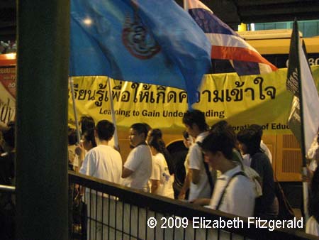 Heralded by a truck of dancing teens singing about their love of Jesus, a few thousand people marched through Siam Square early this evening [Sunday 15 November]. Smiling for cameras, including the one held by this observer, they blocked one full lane of traffic headed towards Phloenchit Road. What made their demonstration intriguing is that they carried signs with Christianity-inspired calls for compassion and the Thai national flag and yellow and blue royal emblem flags. They were clad in a mix of ubiquitous pink and white royal emblem polo shirts and t-shirts with religious messages such as “God Bless You.” When asked what kind of movement they were, three different members of the demonstration responded: “Christian movement.” Yet their use of the royal symbols presents a question: did they carry the royal symbols as an extra measure of safety as they riled traffic police feathers and inconvenienced Sunday afternoon shoppers? Or was there another message?