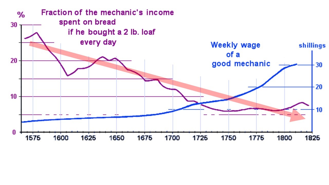 Figure 1 below (from Hearfield 2009) shows the cost of a loaf of bread (and hence of grain) in Britain from 1575 to 1825 (250 years). It shows the cost decreasing in “real” terms (as a percentage of wages, on the left-hand scale) by approximately 75% (from 27% to 7%). The red arrow (added by me, in this and all subsequent figures) emphasises this downward trend.