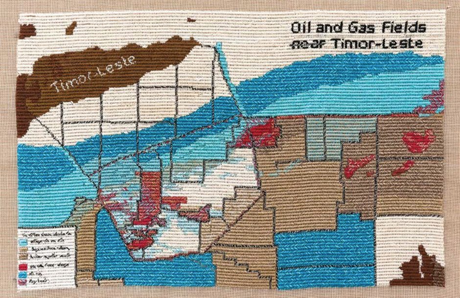 The shifting abstraction of Narelle Jubelin’s petit-point map of ‘Oil and Gas Fields Near Timor-Leste’ (2014) and Ucup’s densely inscribed woodblock banner, ‘Sri against the giant’ (2020), show the strangle-hold operation of arrogant power. The artists point the finger at corporate Australia and Indonesia (and their various foreign partners in crime) as reckless destabilising agents.2 Ucup says about ‘Sri against the giant’: ‘This artwork is dedicated to the people, specially women, where they still resist to government policy, asking for justice. They never stop and never give up against injustice’.