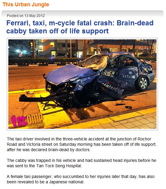 However, in recent days, the spotlight in social media and some parts of the traditional media has focused less on the Hougang by-election and more on a traffic accident that occurred early on the morning of 12 May 2012. A Ferrari, driven by a male PRC national working in the finance industry, crashed into a taxi. The Ferrari driver, the Singaporean taxi driver and a Japanese taxi passenger all died. It turned out that the male PRC national Ferrari driver was an ultra-rich immigrant who owned a penthouse in the upper-middle class area of East Coast, while the Singaporean taxi driver was the sole breadwinner for a family of five. A disturbing video of the accident is available here.