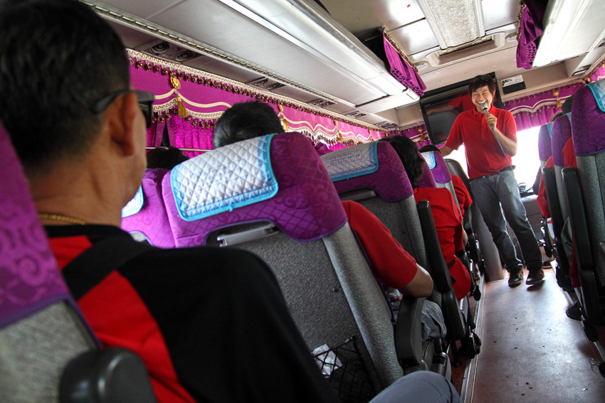 Approaching Siem Reap, the Red Shirts expressed their amazement at how clean Cambodia is, how good the roads are, and asked the driver to drive them around for a tour to see Siem Reap’s city lights, applauding when they saw karaoke parlors or fellow Red Shirts, commenting on how developed Siem Reap is, asking if Siam Reap has katoey as well, and when they saw some, applauding again. The man on the microphone then commented that that they will have to apologise to Cambodia for having looked down upon it before. They then chanted: “Long live Hun Sen, Long Live Thaksin!”