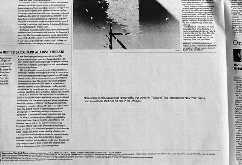 In censorship-stricken Thailand, a lot can be read from a blank space. Last week, printers in Thailand redacted articles from the International New York Times twice, leaving gaping holes in the publication’s pages.