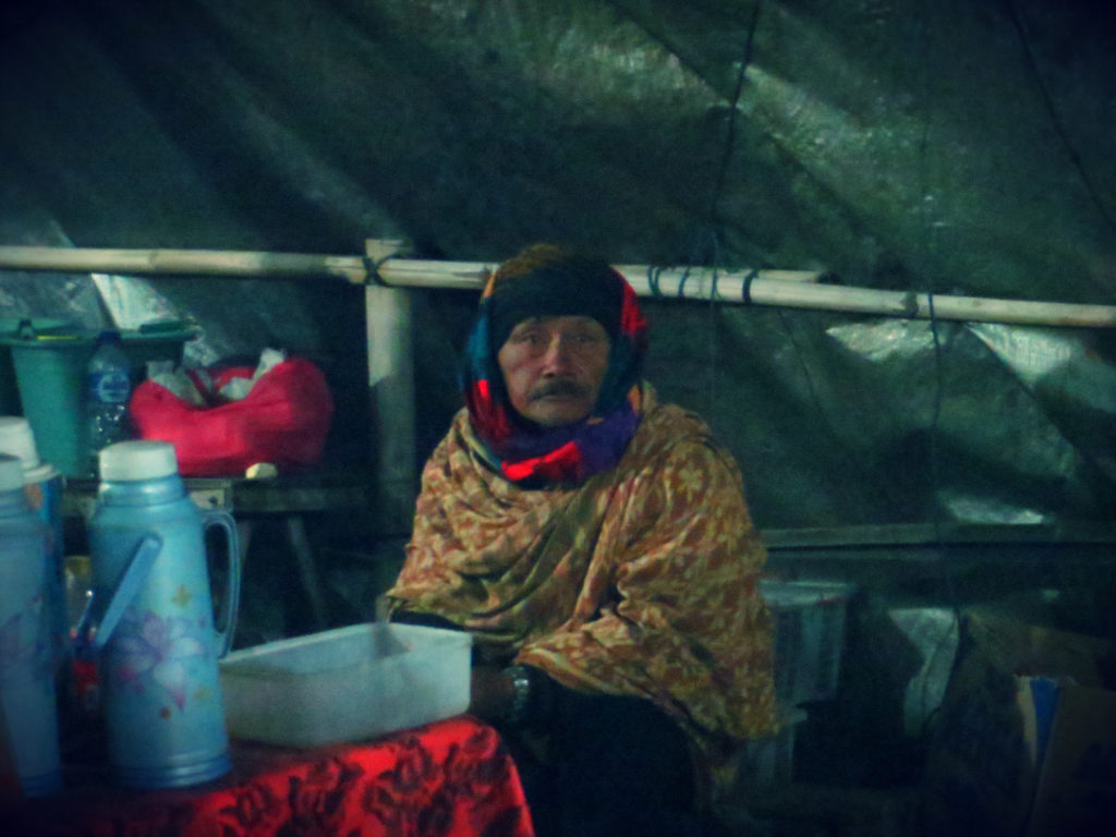 I lean over the verge and see about 100 people inside the steep crater itself, standing about with homemade nets trying to catch the offerings thrown in from people from above. This is an active volcano, and people are inside it, one slip away from death; it’s a mind-boggling sight. An old man approaches me silently asking for an offering. Others walk about in dirty, torn balaclavas that obscure their faces.