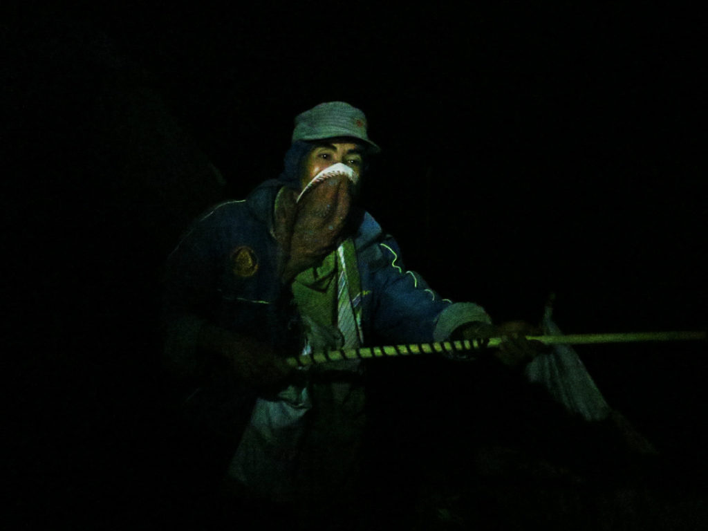 Climbing the steps, we soon reach the summit of the crater, thick smoke all around us – the only visibility coming from our headlamps and a fire crudely made out of rubbish by some locals. It’s eerily silent: a few people coughing, and the faint sound of traditional Indonesian music carrying up from down below. People line the crater, clustered together for warmth. Shining the torch on them only reveals a mass of blankets, often with a pair of eyes shining through. Taking quality pictures in these conditions is virtually impossible. I turn on the flash only to see the extent of dust and debris in the air around us.