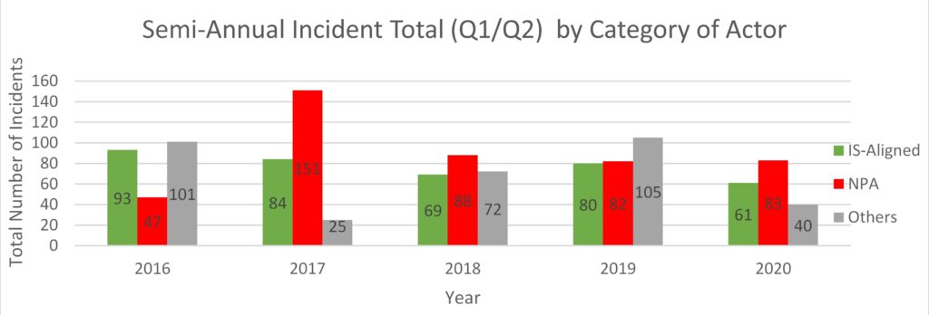 In order to make a proportionate comparison between the number of incidents per year from 2016-2020 that incorporates the minor administrative regional variations in violence discussed, this article compares incidents attributed to specific categories of actors from just the first two quarters of each year. The data is thus divided into three major categories of actors engaged in violence in the Southern Philippines: IS-aligned Groups, the NPA, and Others.
