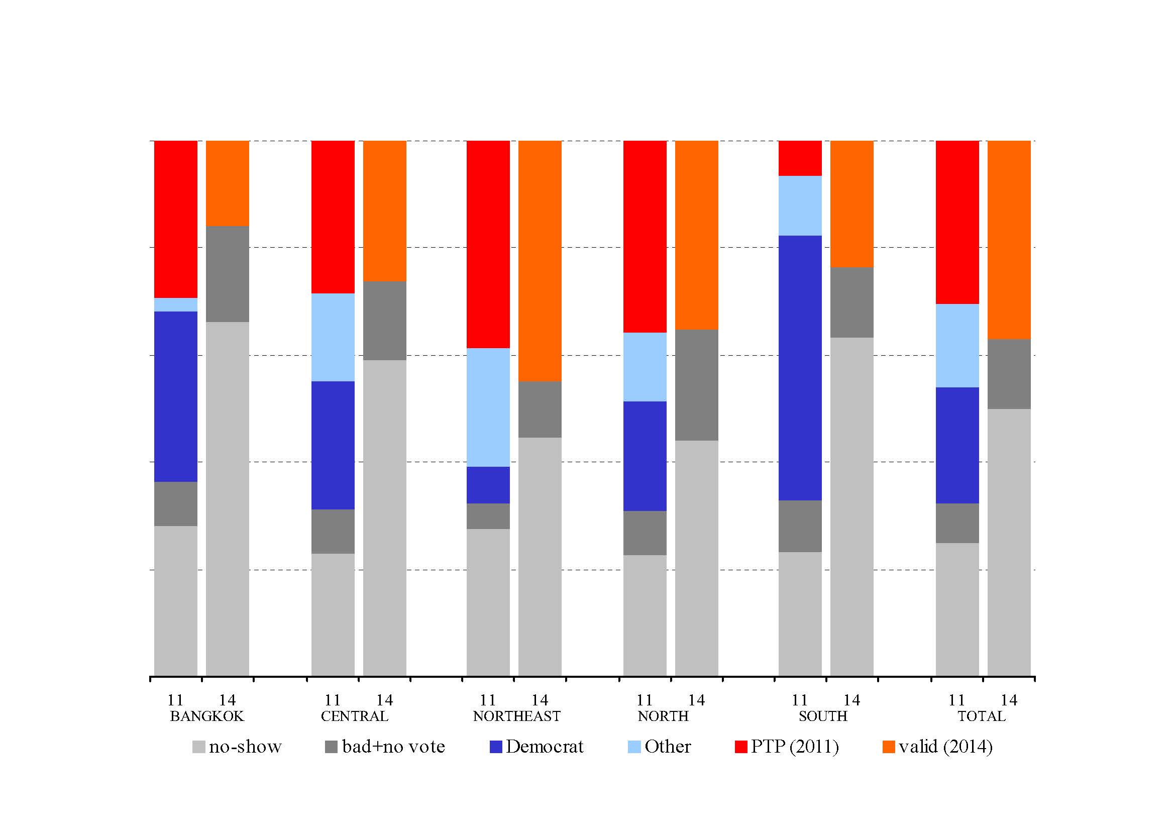 That drop shows in the two right hand columns of the first graphic. The Bangkok column for 2014 is wrong. The voting was abandoned in three constituencies, and only partially completed in two others. In the ECT figures used here, the total electorate figure includes all 32 constituencies, but the voting figures are for only 27 completed constituencies (or perhaps the 29 partially completed, we don’t know). So the 2014 Bangkok bar over-estimates the no-show. The figures for the south also don’t mean much as the 2011 bar is for the whole region, and 2014 for only 5 constituencies.