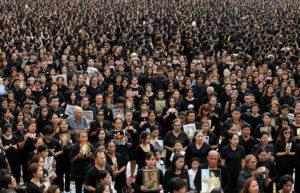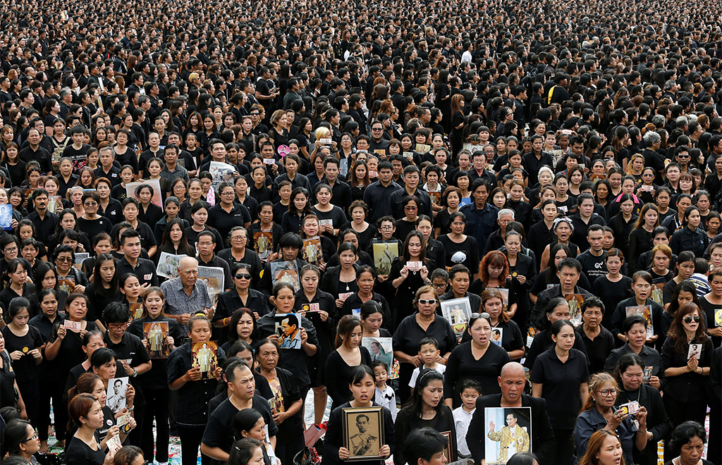 Mourners gather outside of the Grand Palace to sing for a recording of the royal anthem in honour of Thailand’s late King Bhumibol Adulyadej, in Bangkok