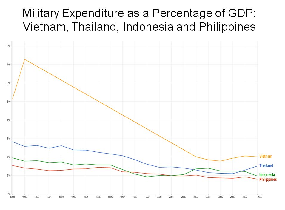 It’s been a while since I posted a graph on New Mandala. Here’s a simple one that is very revealing about the state of politics in Thailand. It shows military spending as a percentage of GDP (from the World Bank – just Google military GDP Thailand and you will get the data). The post-1992 decline is striking, as is the post-2006 rise. The World Bank figures only go up to 2008. I have provided an estimate of the current figure (darker blue line) based on published information about the 2010 budget. (Click on the graph for a larger image.) [UPDATE 29 September 2010: see comment 30 below in relation to my estimate of the most recent rigures.]