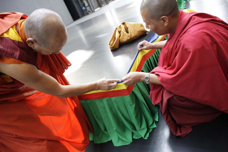 In the Jahrhunderthalle Bochum, formerly a gas-fired powerhouse and now one of the most out-of-the-ordinary culture-cathedral festival halls, a dais with a smooth, black wooden top measuring 5 m x 5 m has been prepared. The creation of the mandala begins with rituals during which the Bhutanese monks consecrate the site and the top of the dais. On the first day, a fringe is added to the dais. With rulers and a wooden compass, the monks sketch an outline of the sand mandala onto the top of the dais. Sand mandalas have been in practice for millennia. There are innumerable designs each with its own meaning to choose from which all share a format of geometric shapes and spiritual symbols.