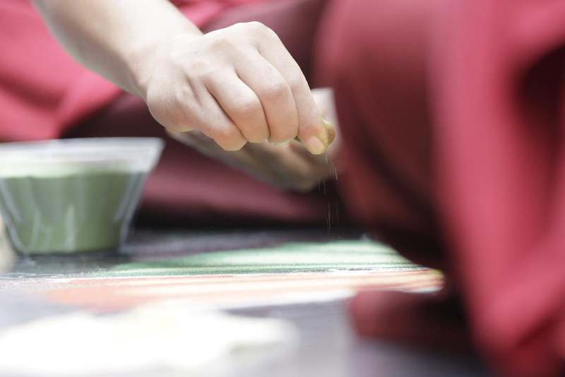 The new sand mandala is complete. It is beautiful and ephemeral. Mandalas are created for rituals of initiation and meditation. This one was created to purify the environment, promote harmony in the world and bless all beings. Shortly after its completion, the sand mandala is destroyed. This is done as a metaphor for the impermanence of all contingent and compounded phenomena. The destruction begins with rituals using the ritual implements vajra: diamond or thunderbolt, male, and ghanta: bell, female. Once the sand mandala has been ritually destroyed, the marble sand is swept together.