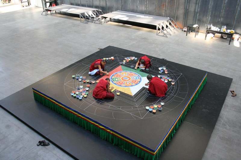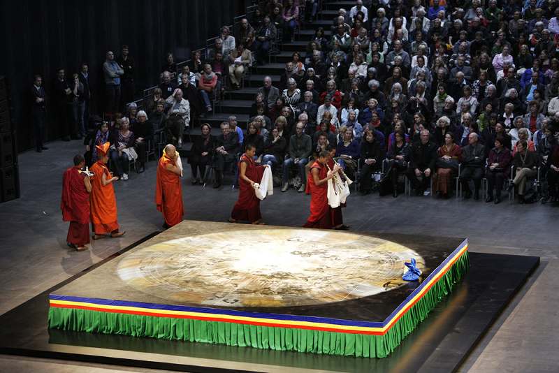 As the climax and conclusion of his artistic directorship of the Ruhrtriennale 2009-2011 Festival [ii], Willy Decker [iii], a practising Buddhist [iv], commissioned the casting of a giant sand mandala from the Drukpa Kagyu school of Bhutanese Buddhism by 6 monks from Bhutan: