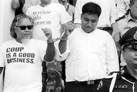 During the first two weeks after the coup, thousands of people came out to protest on the streets. Sombat Boonngamanong, one of the last Red Shirts who opposed the junta, constantly announced meeting places for protest from his Facebook account. The junta responded to Sombat’s movement by blocking the protesters from entering the designated meeting area and arresting the participants after the protest had been dissolved. Furthermore, the junta called more students to report; used loud speakers to drown out the protesters’ voices; and threatened to use force to crack down on the protest. These were measures that effectively decreased the number of demonstrators.