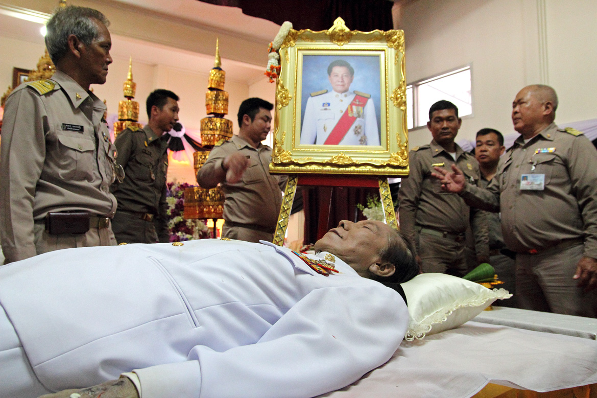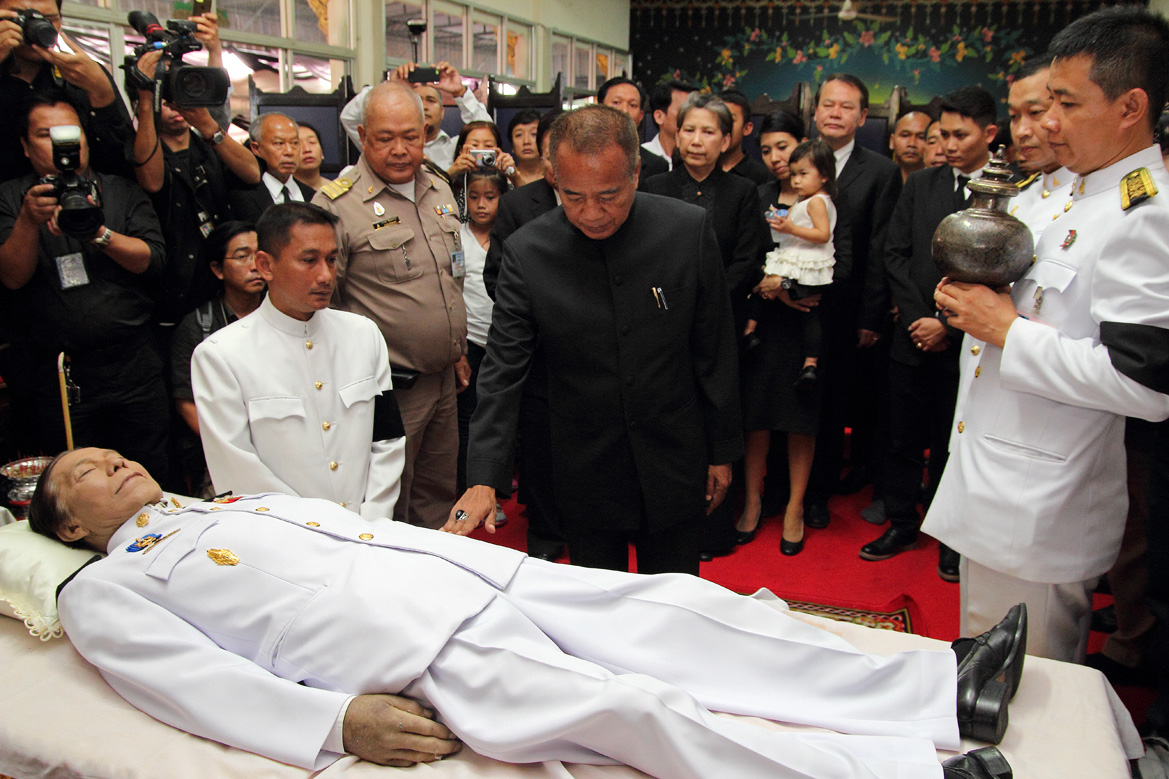 When the bathing ceremony is finished, palace officials erect screens to block the view, perform rites and dress Dr Apiwan in clothes provided by the palace, and his corpse is placed in the coffin.