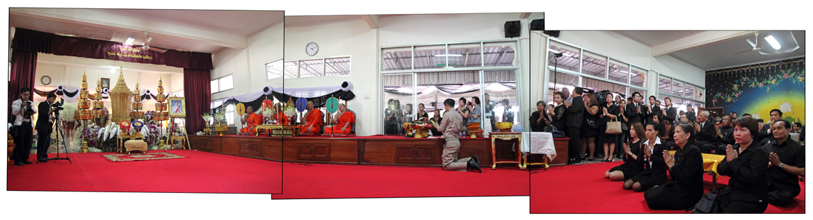 Due to Dr Apiwan’s rank as colonel in the military, royal sponsorship was granted for his funeral and it became an extraordinarily beautiful affair with elaborate rites. For the first three days monks from Wat Saket chanted special ancient sutras (“suat mon”) different from normal funerals and a special bathing ceremony was given with sacred water and scented oils from the palace. At the day of the cremation a special procession around the crematorium with music and monks on litters took place, and the flame to incinerate the coffin was brought from the palace.